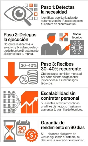 “Si en los primeros 90 días, siguiendo exactamente nuestro sistema y entrenamiento, logras vender al menos 15.000 € en proyectos o servicios a tus clientes, te devolvemos los 2.500€ de activación.”